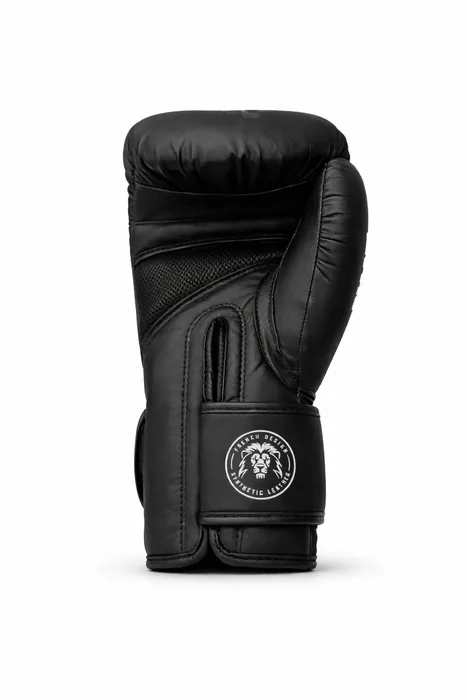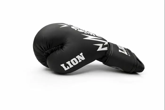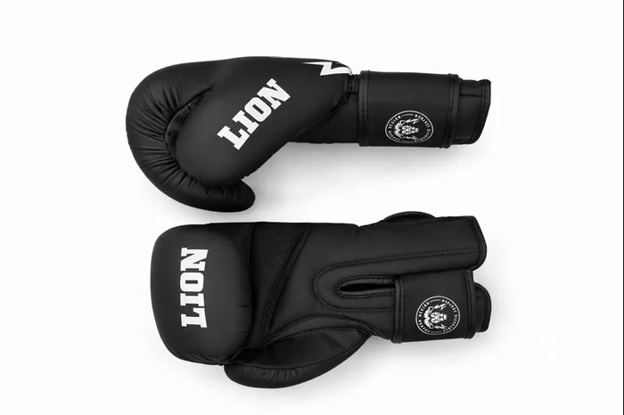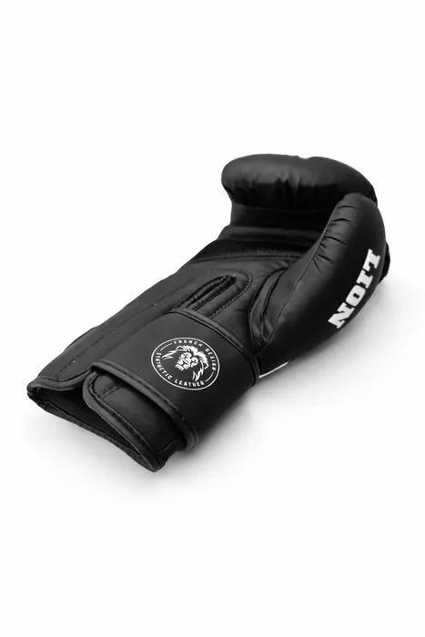 הכפפות עשויות עור סינתטי מט (PU) איכותי ועמיד במיוחד. הגימור השחור-מט משולב עם לוגו LION מודפס בלבן, למראה יוקרתי, נקי ומקצועי בזירה ובאימון.